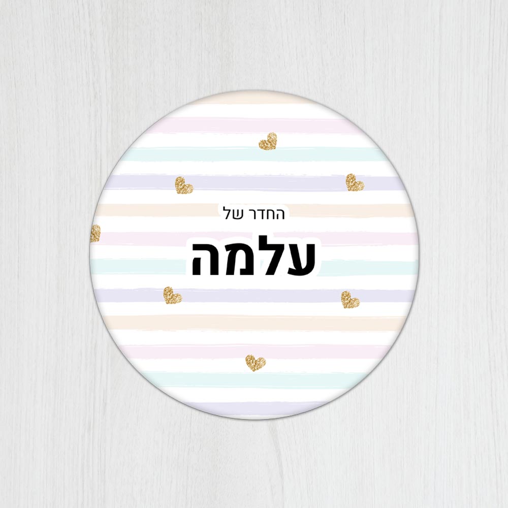 שלט עץ עגול מעוצב לחדר ילדים בכיתוב אישי – דגם פסים ולבבות זהב