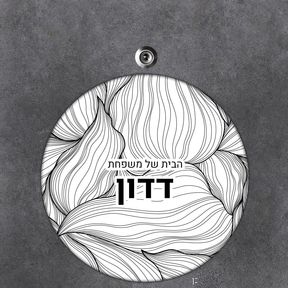 שלט עץ עגול מעוצב לדלת הבית בכיתוב אישי – דגם טקסטורת פריחה שחור לבן הוא שילוב מרהיב של קלאסיות ואלגנטיות.