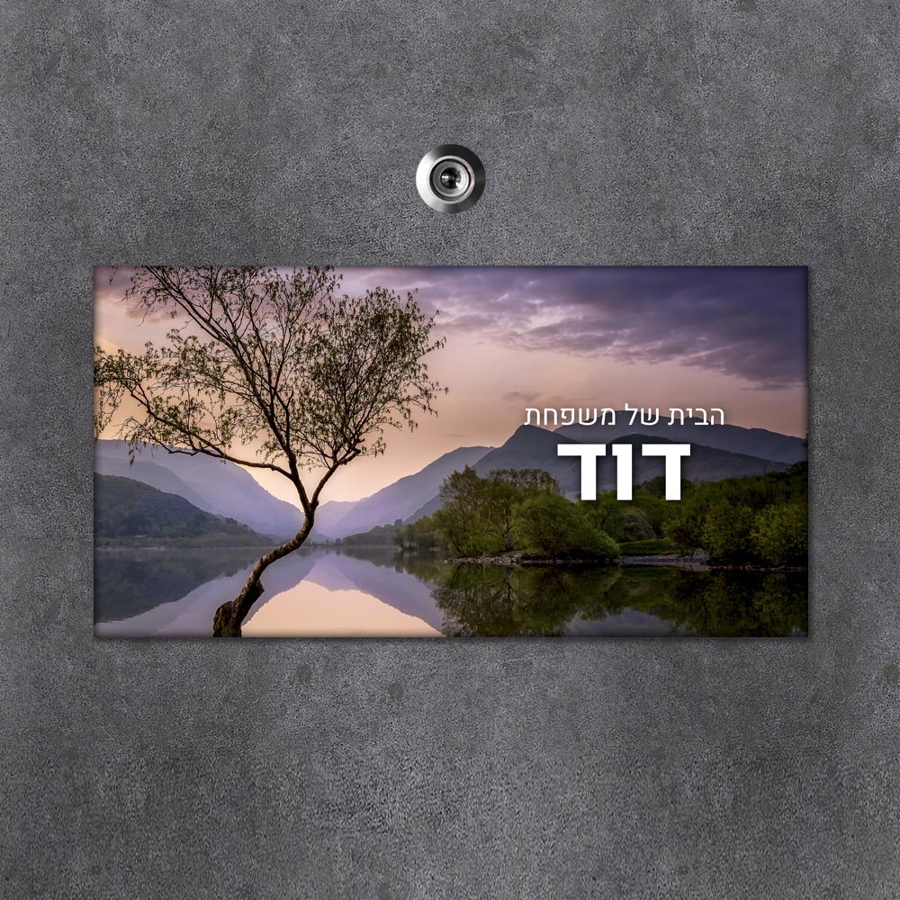 שלט עץ מלבני מעוצב לדלת הבית בכיתוב אישי- דגם נוף טבעי