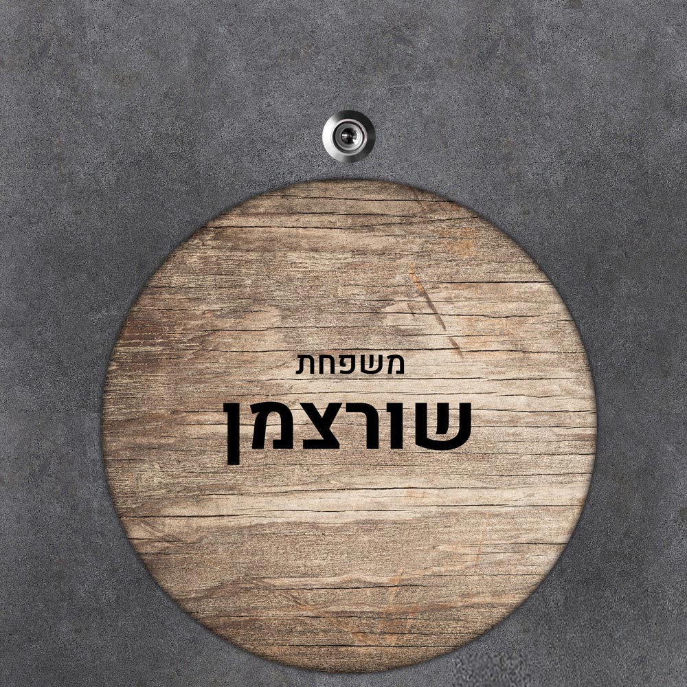 שלט עץ עגול מעוצב לדלת הבית בכיתוב אישי- דגם משטח עץ בהיר