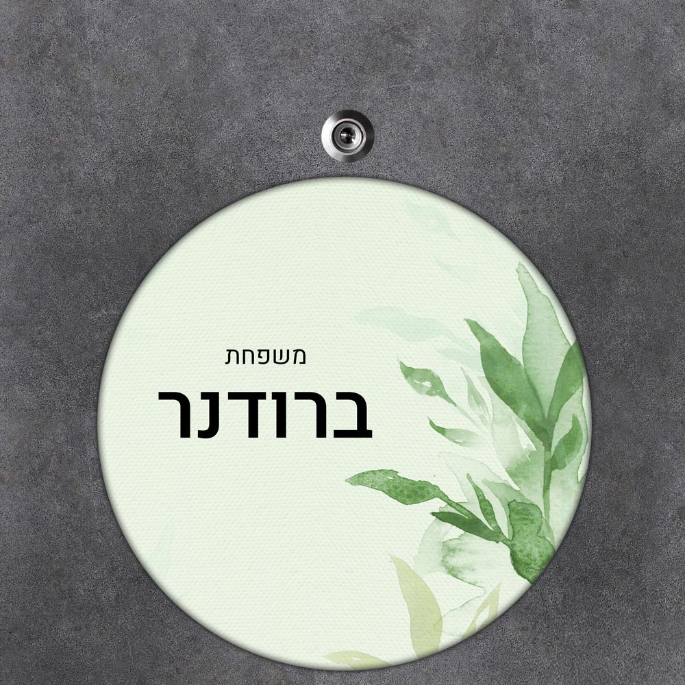 שלט עץ עגול מעוצב לדלת הבית בכיתוב אישי – דגם עלים בצבעי מים הוא דגם מלא רוך ואומנות, שמביא את קסם האקוורל אל הכניסה לבית.